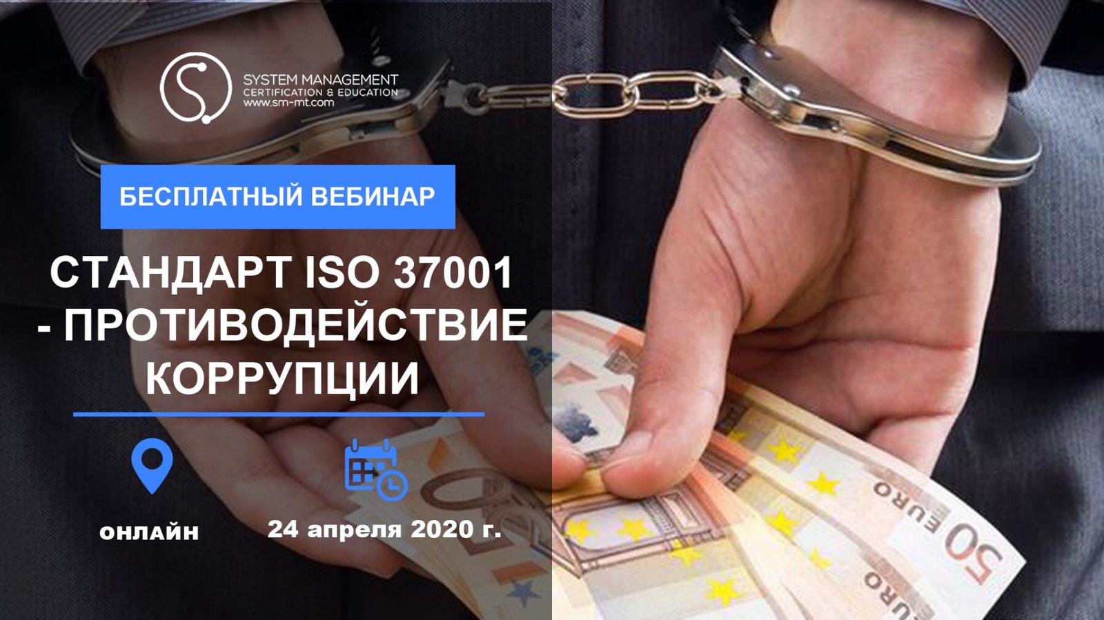 Апреля 2020БЕСПЛАТНЫЙ ВЕБИНАР: Обзор международного стандарта ISO 37001:2016 «Системы менеджмента противодействия коррупции – Требования и рекомендации по применению»