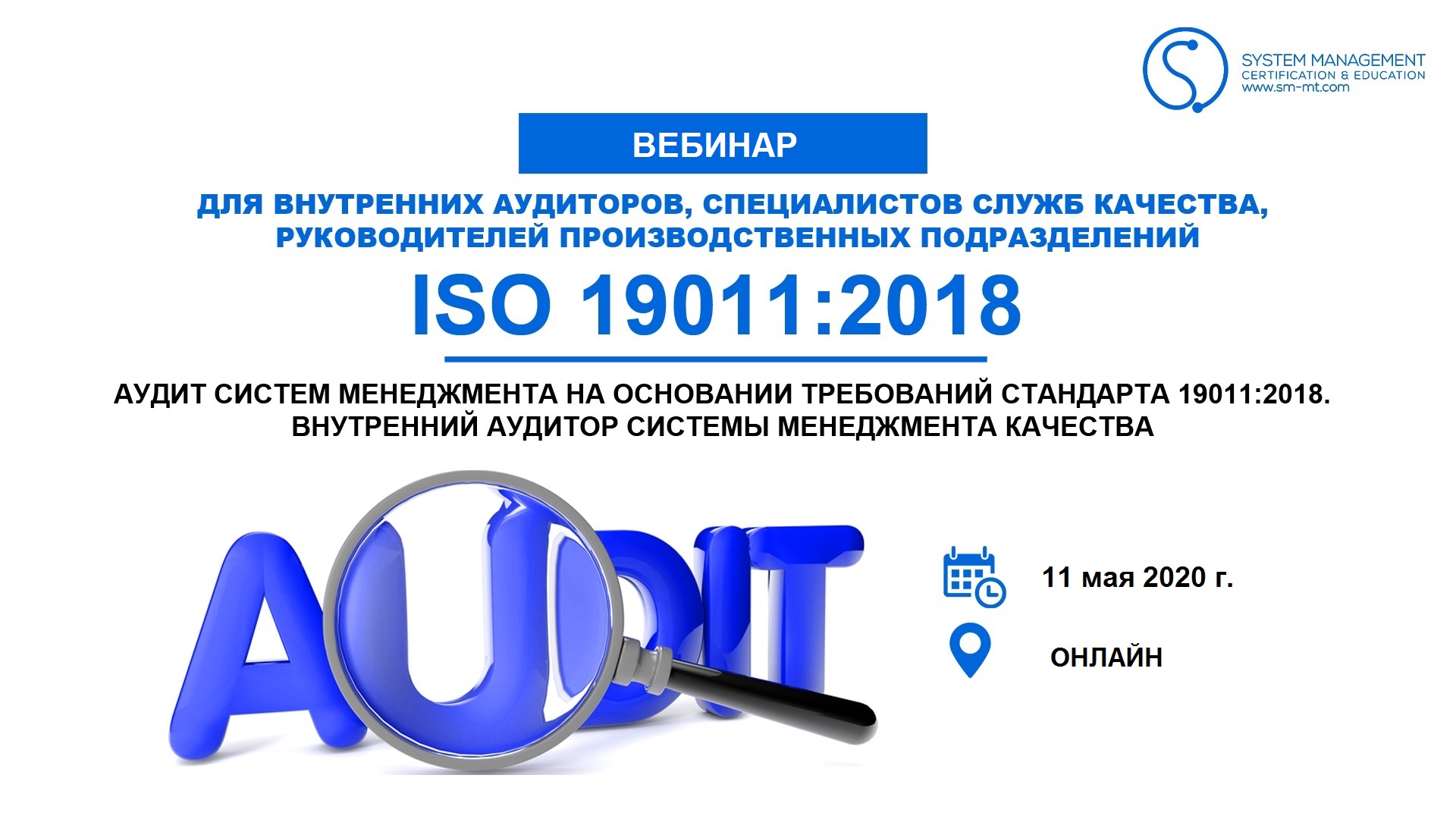 Марта 2020БЕСПЛАТНЫЙ ВЕБИНАР: Внутренний аудитор Систем Менеджмента на базе стандарта ISO 19011:2018