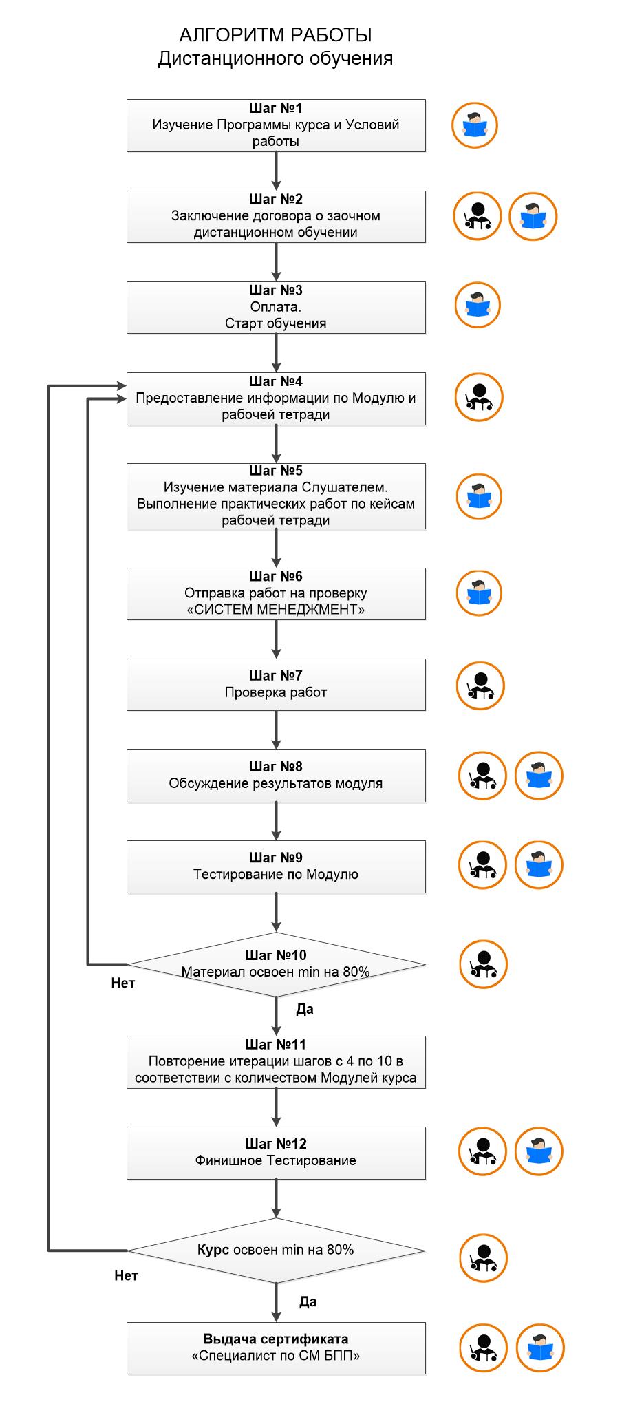 Шаги 4-10: Мы отправляем Вам материал для изучения и подготовки Модуля № 1 и Кейс Модуля № 1. Вы изучаете материал и работаете с кейсами. Решенные задачи отправляете на е-mail для проверки. Если результативность решения задач более 80% – переходим к кейсу № 2. Если менее 80% – отправляем на доработку.