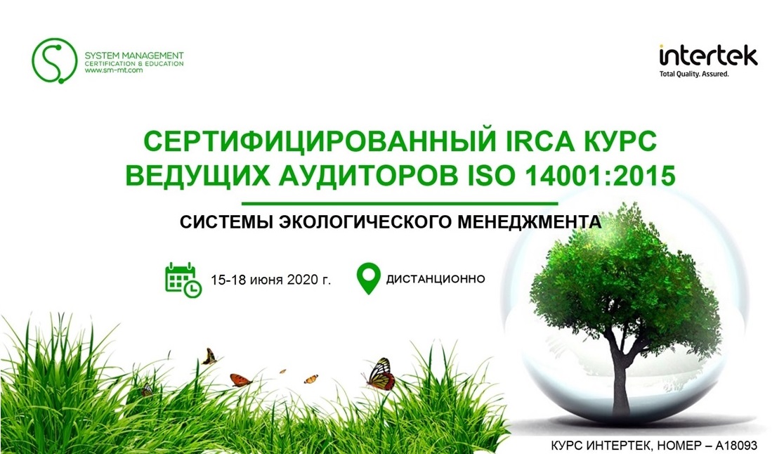 Июня 2020КУРС IRCA ВЕДУЩИЙ АУДИТОР ПО СИСТЕМЕ ЭКОЛОГИЧЕСКОГО МЕНЕДЖМЕНТА в соответствие с требованиями международного стандарта ISO 14001:2015 (15-18 ИЮНЯ, 2020)